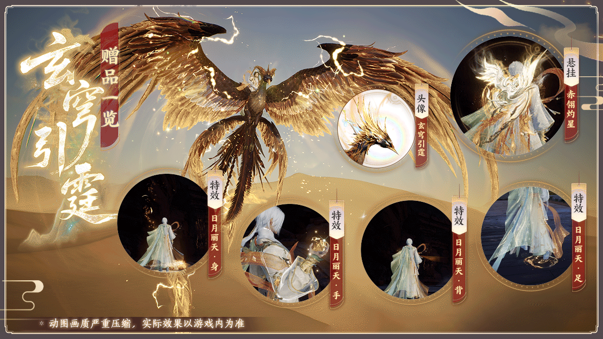 解锁【玄穹引霆】(金色)即可获得赠品挂件【悬挂·赤翎灼星】、头像【玄穹引霆】、环身特效【日月丽天·身】、背部特效【日月丽天·背】、手部特效【日月丽天·手】、足部特效【日月丽天·足】。