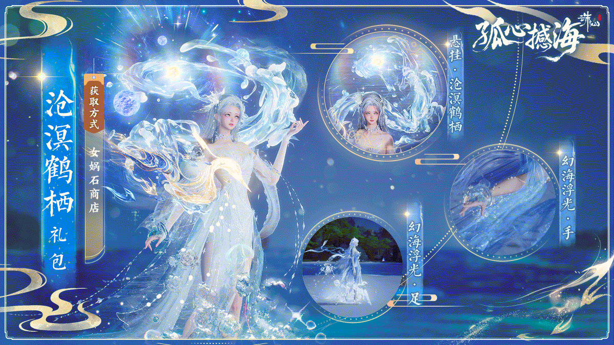 谓我不愧君,青鸟明丹心!包含挂件【悬挂·沧溟鹤栖】、手部特效【幻海浮光·手】、足部特效【幻海浮光·足】,售价1颗女娲石。
