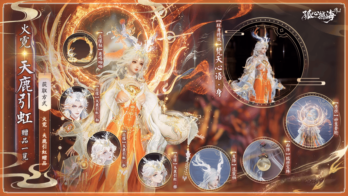 华裳之轮新增主题时装礼包【火霓·天鹿引虹】,也可消耗2颗女娲石在女娲石商店兑换获得。【火霓·天鹿引虹】主题时装礼包包含时装【火霓·天鹿引虹】、环身特效【梵天心语·身】,【悬挂·妙慧金轮】、【发饰·流霞栖】、【面饰·瑞祥宝珠】、置景动画【踏金霄】、结算动画【冠绝·幻舞飞天】、【头像·天鹿引虹】、【头像框·鹿鸣呦呦】。