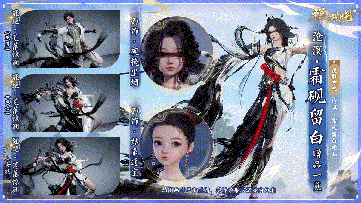 购买【沧溟·霜砚留白】可获赠【面饰】砚掩尘烟、【面饰】结系通宝以及【冠绝动画】笔落惊澜。